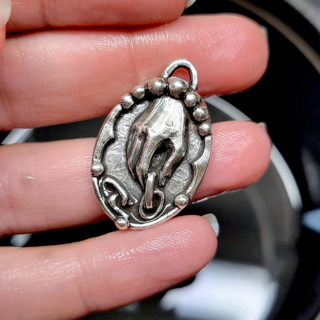 This gorgeous 'Breaker of Chains' pendant was a custom design that I absolutely loved making and decided to offer to the public.. BUT I forgot to photograph it properly before I shipped it out (face palm). Once I make another I will update the photos! In the meantime, this piece is solid sterling silver and quite hefty, with a shadowbox style frame surrounding a relief sculpture of a hand holding a broken chain.  The design was inspired by an antique carving of unknown origins featuring a similar motif, from what looks like a headstone.  The flat back side of the pendant is hallmarked with both 925 and my XF maker's mark. Comes on a sterling silver cable chain of your chosen length.