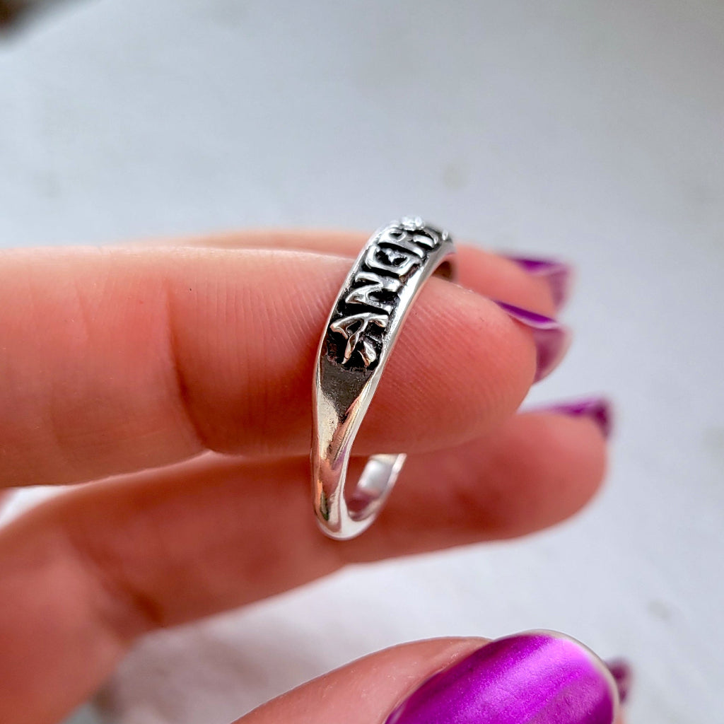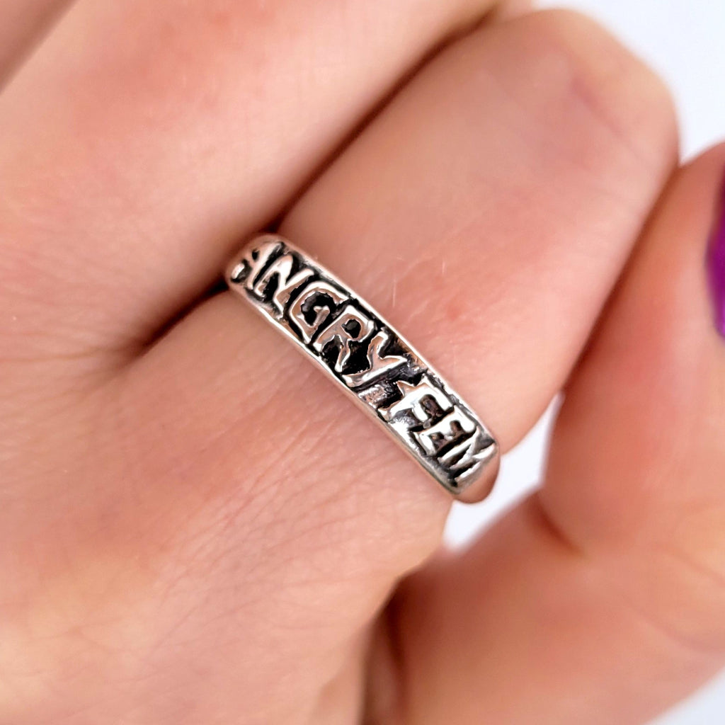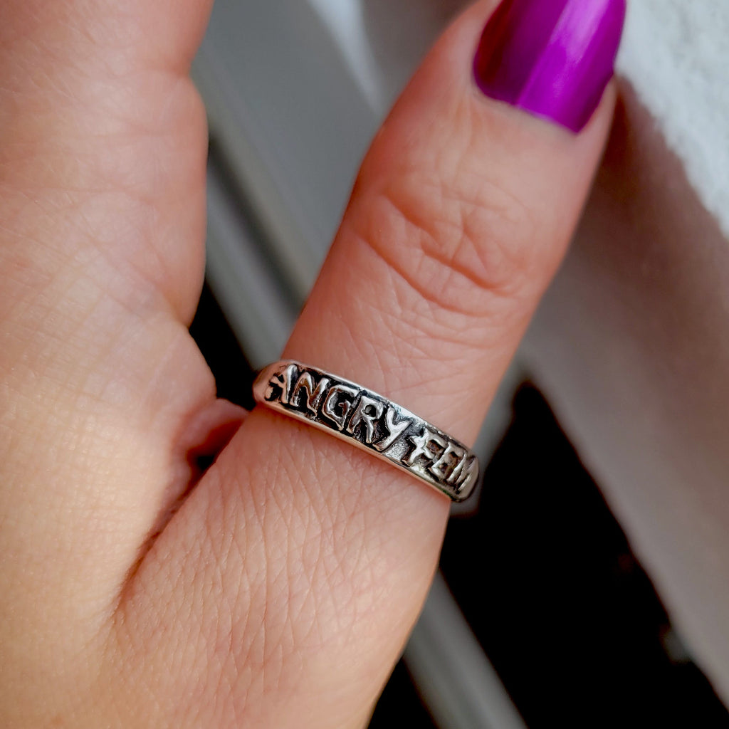 This one is for my ladies. The Angry Fem ring features hand carved, raised letters on a smooth curved band. The ring is cast in solid sterling silver and tapers to a slim comfortable band along the back. The words are patinated for added contrast, adding a bold effect. The inside of the band is hallmarked with both 925 as well as my XF maker's mark.