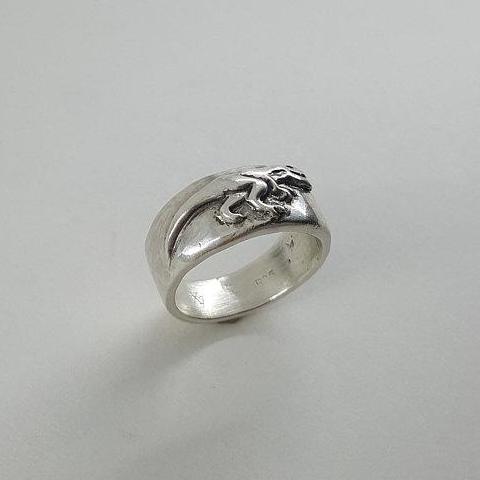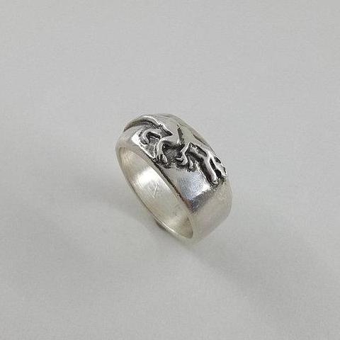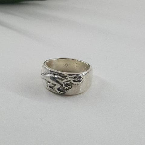 T-rex Ring in Sterling Silver: Features a relief style t-rex on a heavy wide band. Because of the width of the band, consider sizing up a half size. Wide bands tend to fit tighter than thinner bands.